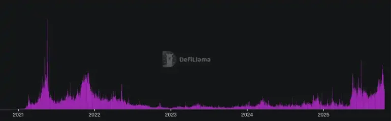 这种市场情绪并非个案,Defillama 链上数据显示,10 月 8 日 Bsc 链的交易量猛增至 60.5 亿美元,一度达到了 2021 年 BSC 上一轮机制币山寨行情的盛况,只不过这一次是由中文 Meme 带领的。